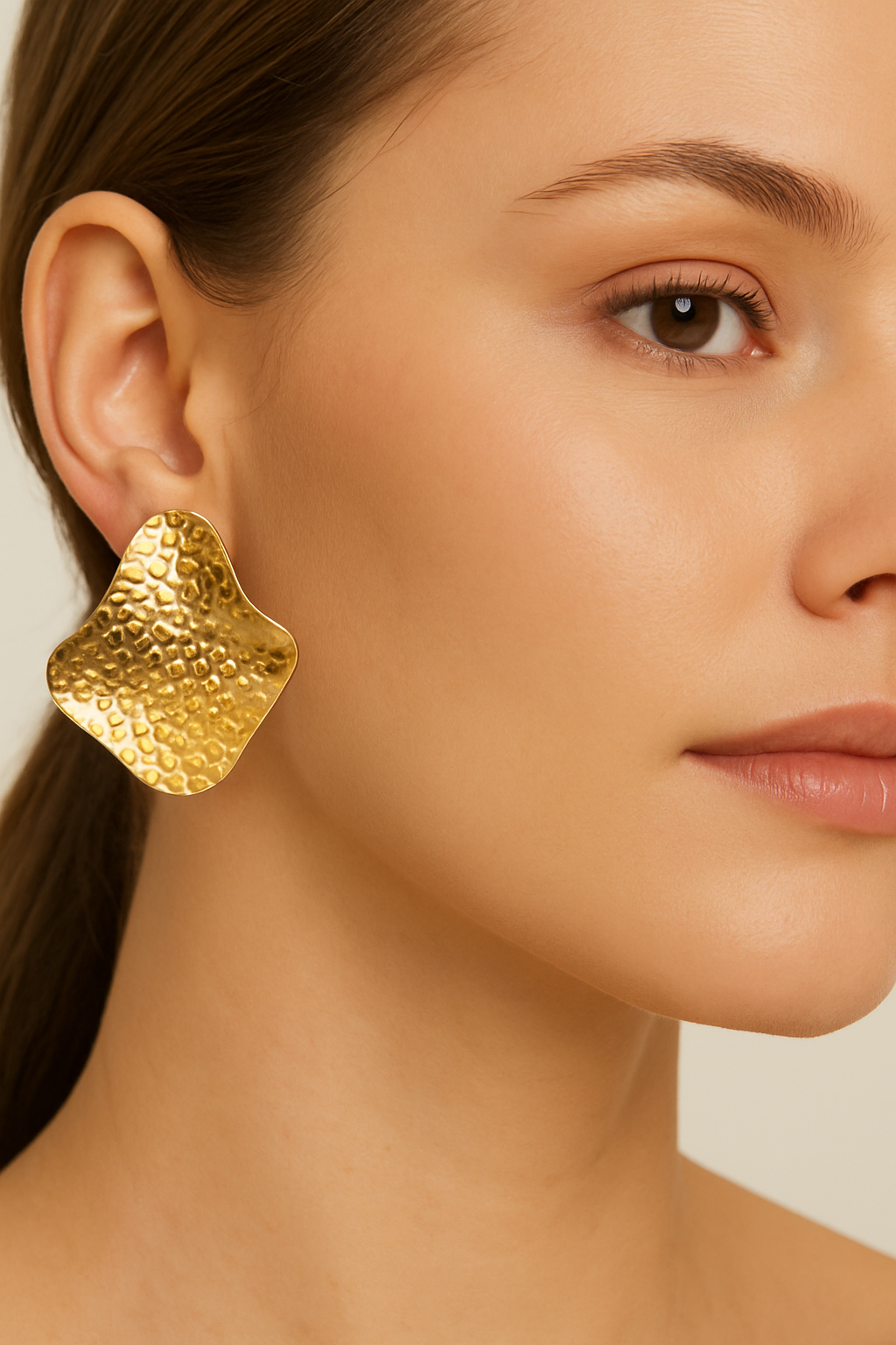 Elevate your style with the Anti-Tarnish Hammered Wave Stud Earrings in gold finish. Designed with a chic, organic wave shape and a beautiful hammered texture, these earrings bring a blend of modern artistry and timeless elegance. The premium anti-tarnish coating ensures they retain their brilliant shine, wear after wear. Lightweight and versatile, they are perfect for adding a statement touch to both everyday outfits and special occasions.
