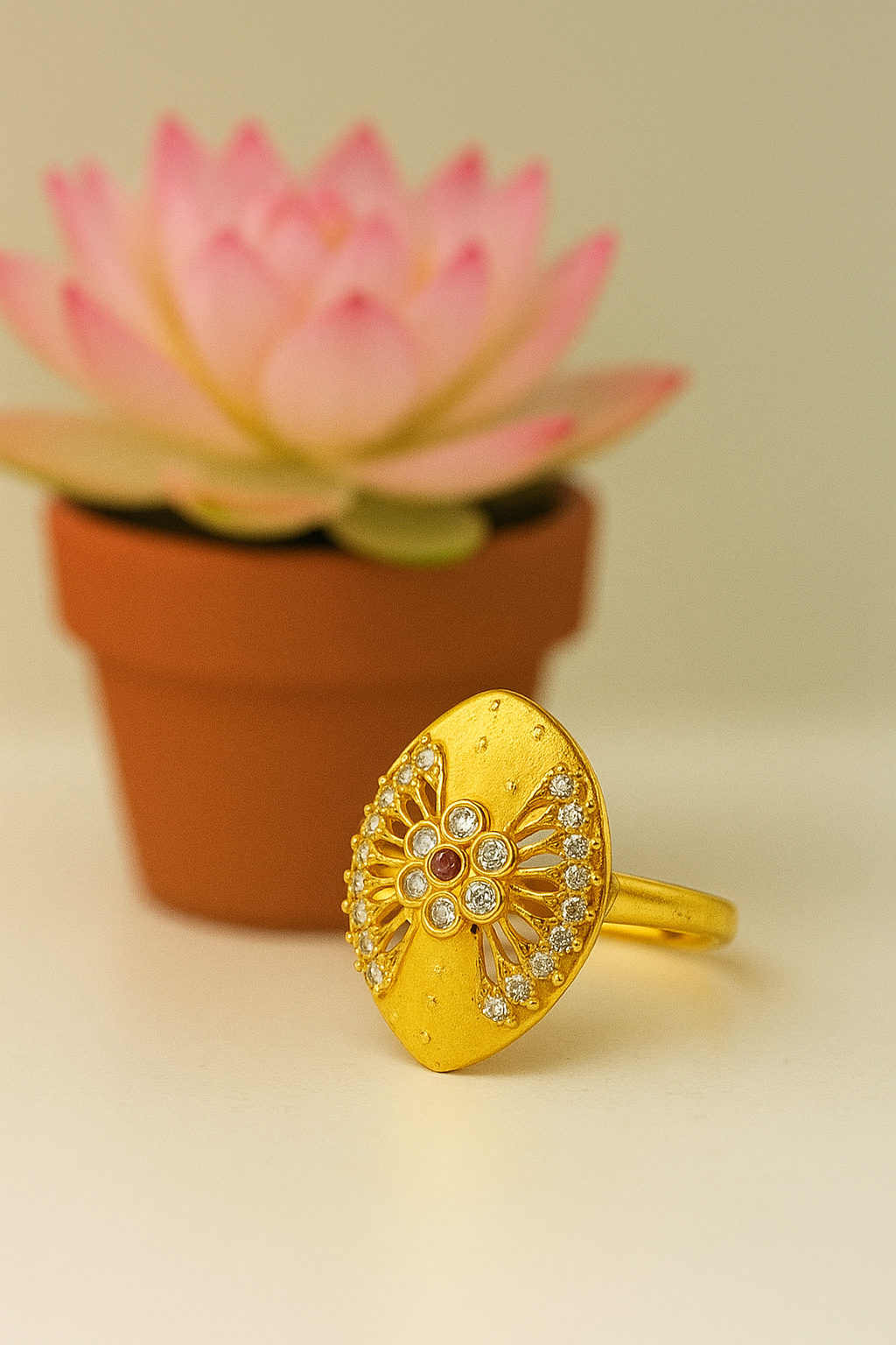Anti-Tarnish Ornate Floral Statement Ring – Gold Finish & Diamond Ruby Accents