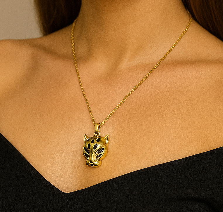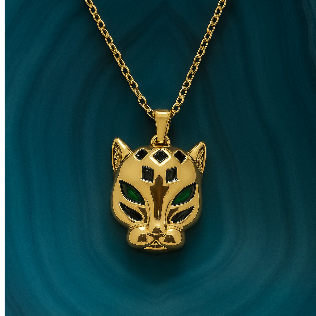 Unleash bold elegance with the Anti-Tarnish Panther Charm Necklace. This striking gold-tone necklace features a fierce panther head pendant, detailed with black enamel accents and mesmerizing green eyes. Designed with an anti-tarnish coating, it ensures long-lasting shine and durability. A statement piece that symbolizes strength, power, and confidence — perfect for both casual wear and special occasions.